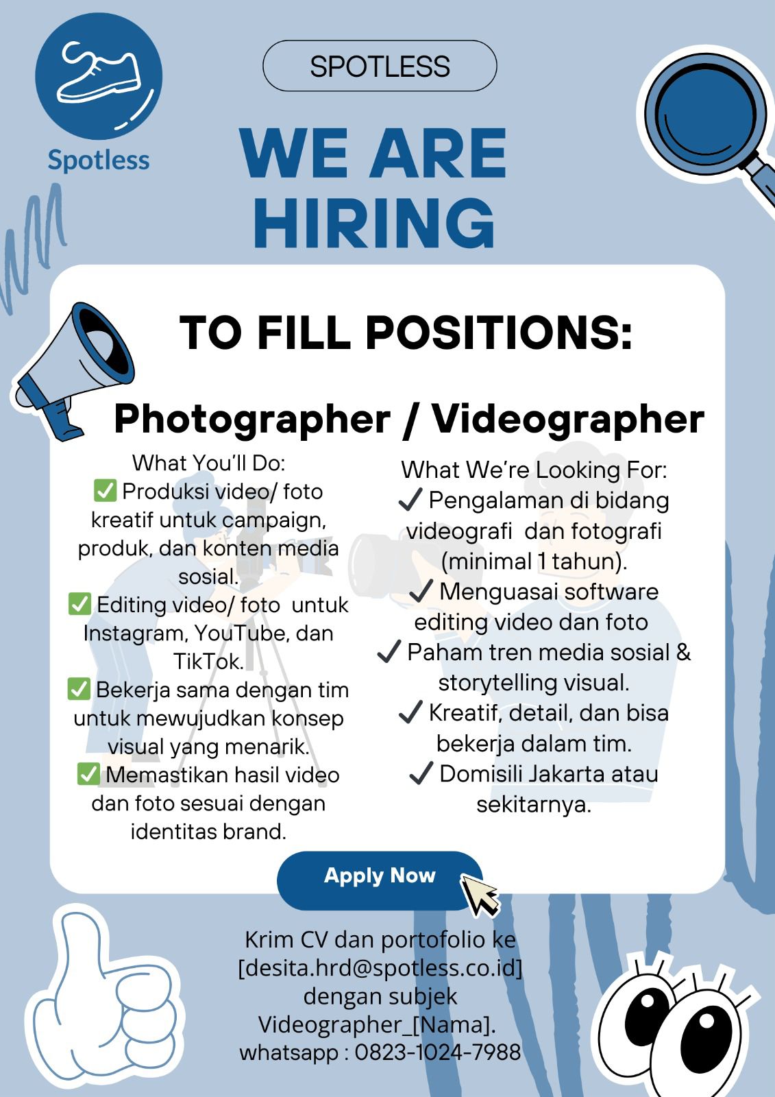 Hi Spots , Kamu bisa mengirimkan CV dan Portofolio kamu ke email desita.hrd@spotless.co.id atau kamu bisa juga untuk mengisi formulir lamaran kerja di bawah ini yah!